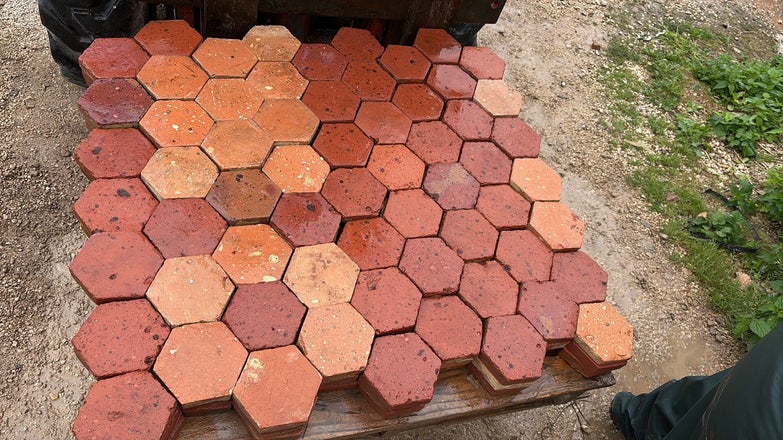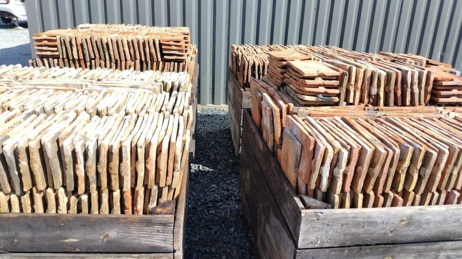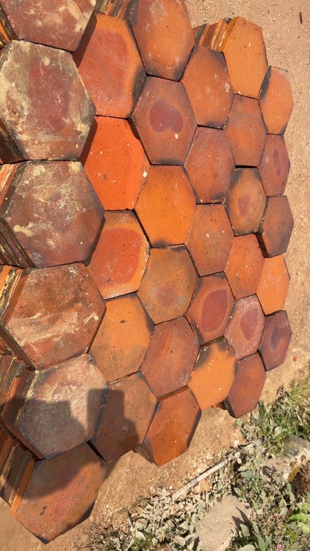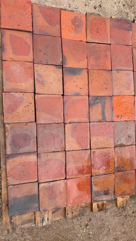 Carreaux anciens de récupération : de couleurs rouges, orangées, orangées clairs, jaunes, panachés :